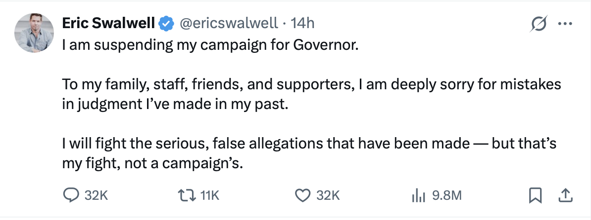 Swalwell suspended his gubernatorial campaign Sunday. “I am suspending my campaign for Governor,” Swalwell announced in a short statement on X. “To my family, staff, friends, and supporters, I am deeply sorry for mistakes in judgment I’ve made in my past.” Swalwell’s campaign co-chair had resigned in the wake of the allegations, and top House Democrats had urged him to drop out of the race.