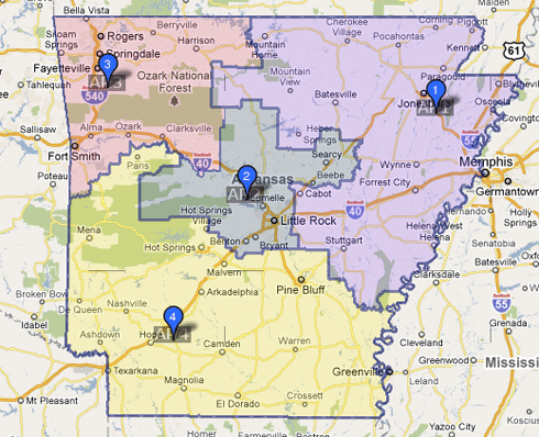 Arkansas-congr-dists ← Previous Next → The current layout of Arkansas’ congressional districts. (govtrack.us)