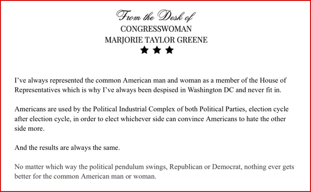 In her resignation announcement, Rep. Greene said, “I have too much self-respect and dignity, love my family way too much, and do not want my sweet district to have to endure a hurtful and hateful primary against me by the President we all fought for, only to fight and win my election while Republicans will likely lose the midterms.”