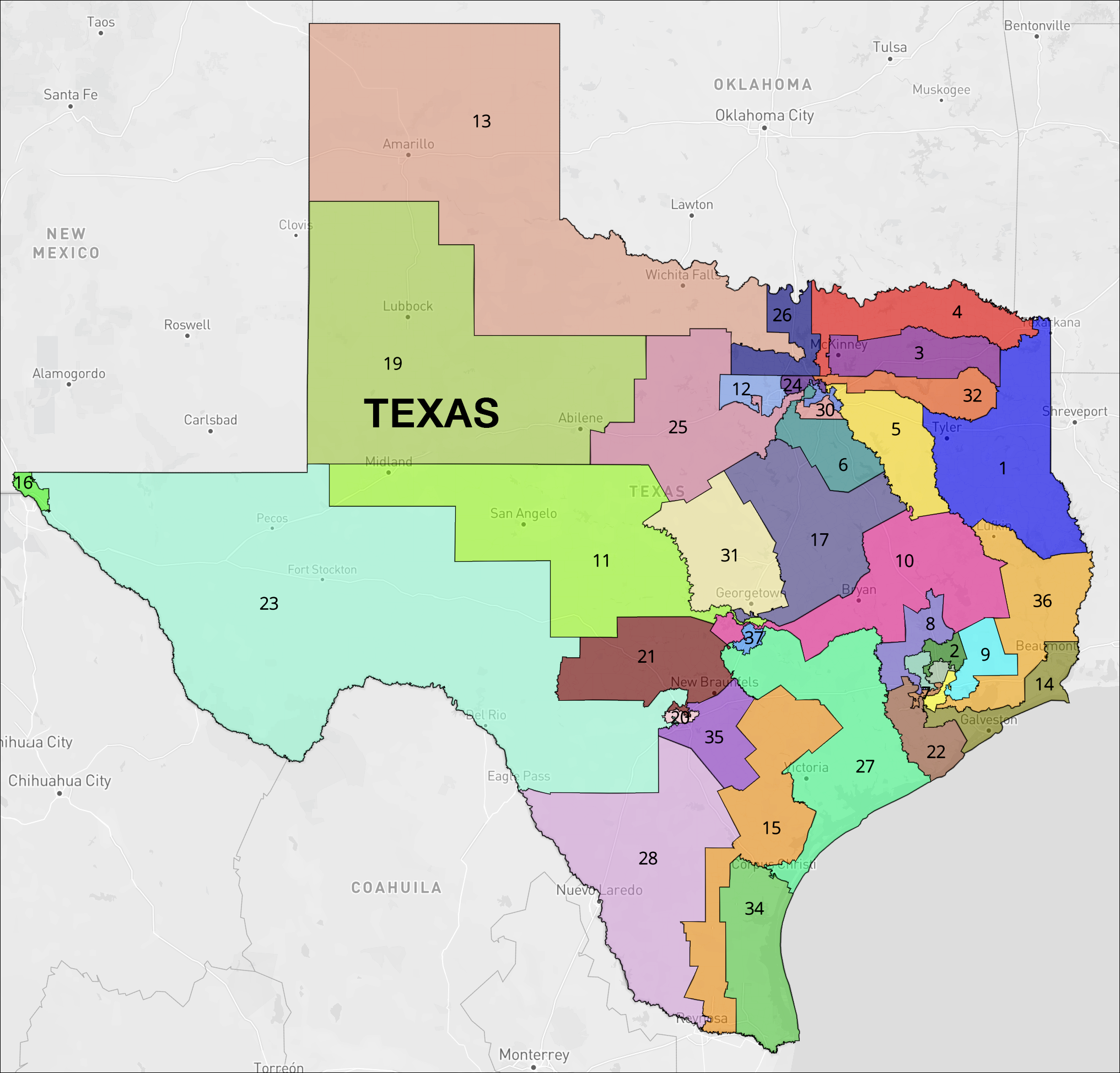 2026 Texas Congressional Districts Map. Click here or on the above map to see an interactive version at: Dave’s Redistricting App.