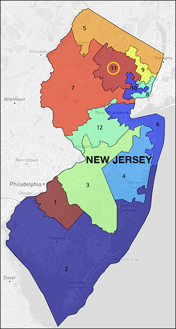 New Jersey’s 11th CD lies in the northern part of the state and encompasses parts of three counties, Essex, Morris, and Passaic. The district is anchored in Morris County where the 11th covers approximately three-quarters of the local population. Another approximately 300,000 individuals reside in Essex County, with the remaining 80,000-plus more in Passaic. The main population centers are the cities of Morristown, Montclair, and Broomfield, the latter two located just northwest of Newark.