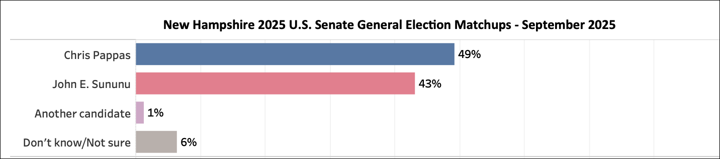 The UNH poll (Sept. 17-23; 1,361 New Hampshire adults; 1,235 likely general election voters; 529 likely New Hampshire Republican primary voters; online) finds Rep. Pappas leading a ballot test question with ex-Sen. Sununu 49-43 percent, but the sampling universe leans more Democratic than the actual voting data suggests. Therefore, it is likely that Sununu is a bit closer to Pappas than this spread foretells.